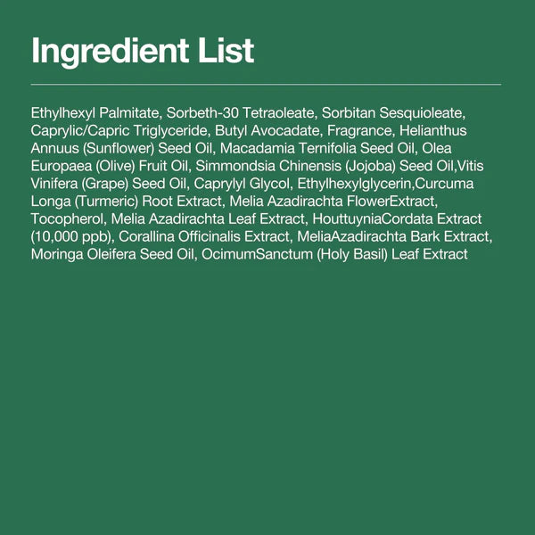 Ingredients: Ethylhexyl Palmitate, Sorbeth-30 Tetraoleate, Sorbitan Sesquioleate, Caprylic/Capric Triglyceride, Butyl Avocadate, Fragrance, Helianthus Annuus (Sunflower) Seed Oil, Macadamia Ternifolia Seed Oil, Olea Europaea (Olive) Fruit Oil, Simmondsia Chinensis (Jojoba) Seed Oil, Vitis Vinifera (Grape) Seed Oil, Caprylyl Glycol, Ethylhexylglycerin, Curcuma Longa (Turmeric) Root Extract, Melia Azadirachta Flower Extract, Tocopherol, Melia Azadirachta Leaf Extract, Houttuynia Cordata Extract, Corallina Officinalis Extract, Melia Azadirachta Bark Extract, Moringa Oleifera Seed Oil, Ocimum Sanctum Leaf Extract